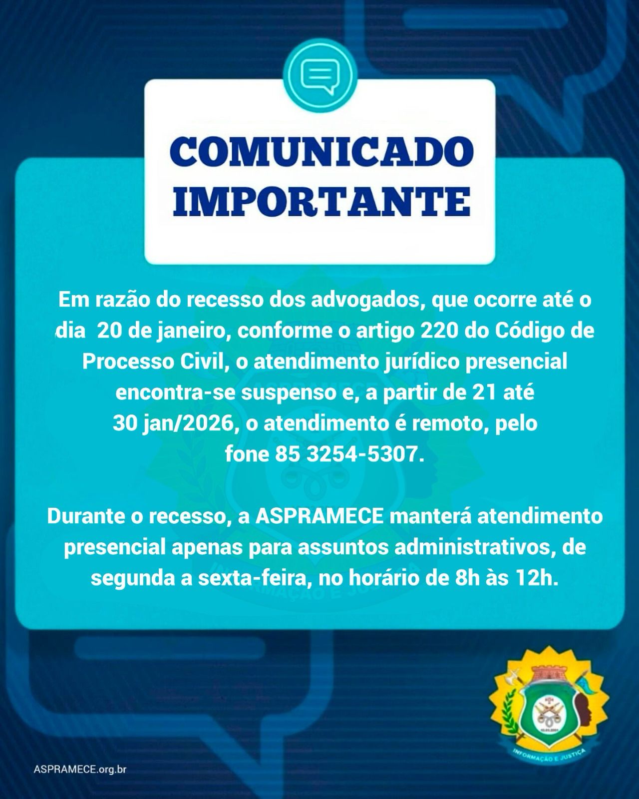 Uma nova versão do Processo Judicial Eletrônico (PJe) será implementada e estará disponível a partir desta segunda-feira, 12 de janeiro de 2026. Para viabilizar a atualização, o sistema passará...