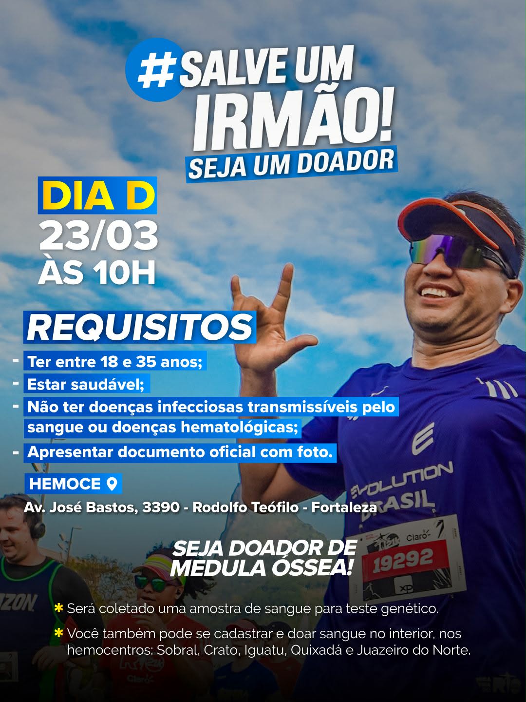 Diante dessa possibilidade, surgiu a ideia de promover uma mobilização social para ampliar o número de pessoas cadastradas como doadoras de medula óssea e também incentivar a doação de sangue. A campanha foi carinhosamente batizada de #SalveUmIrmão pelo presidente estadual do União Brasil no Ceará, Capitão Wagner.
